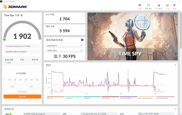 由于笔者拿到的这款荣耀MagicBook V 14并非搭载MX 450独立显卡的版本,所以仅测试处理器上集成的Iris Xe核芯显卡,显卡内建96组EU,1350MHz频率。在3DMark的Fire Strike中GPU得分5400分,Time Spy中GPU得分1760分。