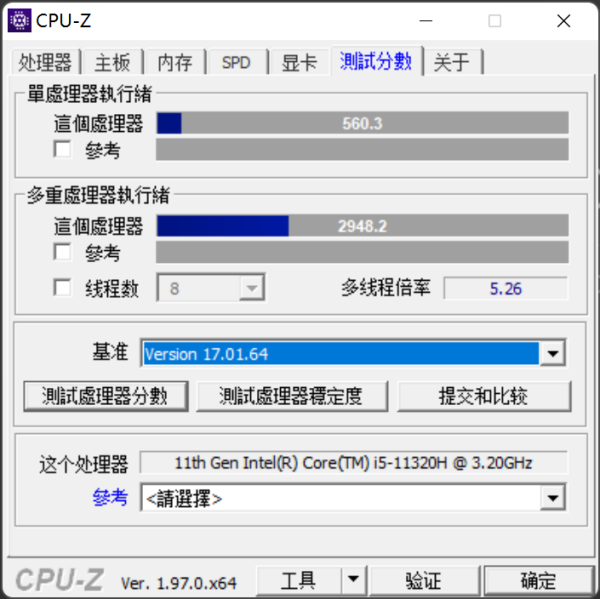 在CPU-Z的基准测试中,英特尔酷睿i5-11320H的单核得分为560.3,多核得分2984.2。