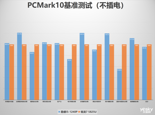 从结果上来看,在不插电的情况下,酷睿i5-1240P的性能下降幅度要更小一些,保持着更高的生产力水准,其中最明显的就是网页性能,酷睿i5-1240P仅仅下降了不到5%,而锐龙7 5825U则下降了近20%。