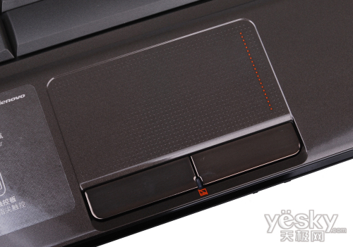联想IdeaPad Y460的触摸板除了可支持多点触控功能外,细节上也有不少贴心设计,例如板面上整齐排布的颗粒凸起能有效提升操作手感,利用右侧的滚动条可以方便浏览网页或文档,如果担心敲击键盘时碰到触摸板会引起误操作,用户还可以通过组合键关闭触摸板,这时双键中间的锁定指示灯也会随之亮起。在触摸板两侧的掌托上,我们还可以看到这款产品的相关技术支持,除了前面提到的一些独特功能外,这款产品还拥有Intel酷睿i5处理器、ATI移动版独立显卡、Windows7操作系统、联想双E认证、杜比音效认证、闪联等实用平台和技术。