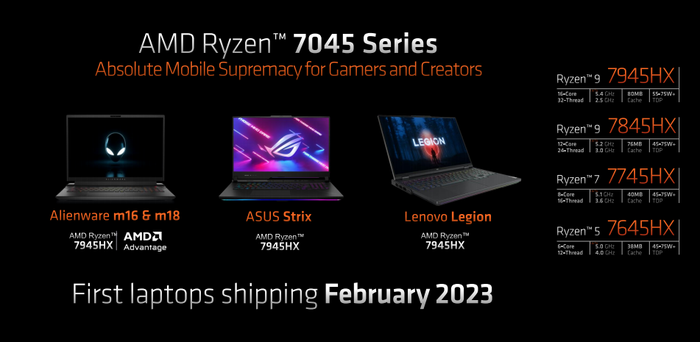 ??AMD这边也是一样,重点介绍的是全新Zen?4架构的锐龙7045系列,包含四款型号,其最顶级的锐龙9?7945HX采用16核32线程,64MB三级缓存,参数上同样的看齐的是桌面的旗舰锐龙9?7950X。