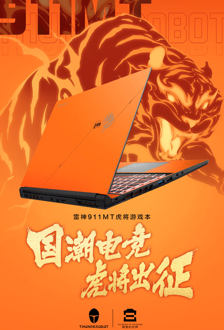 ??雷神911MT虎将版的设计灵感来源于故宫博物院藏文物“战国·王命传任虎节”,机身整体采用了宫中建筑琥珀色琉璃瓦的配色,彰显宫中的大气风范,同时把虎将纹饰置于A面中央位置,极具视觉冲击力,触控板、电源键以及外包装上同样也融入了相关元素,满满的中国风。