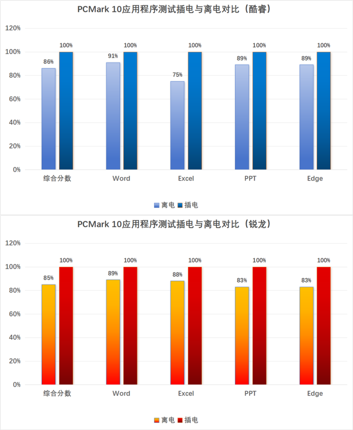 酷睿机型依然保持着领先,综合成绩领先来到了25%,对比插电状态更大了一点点,而各个子项目上,除了Excel的差距被拉近了一些外,其余项目差距均变得更大了一些。