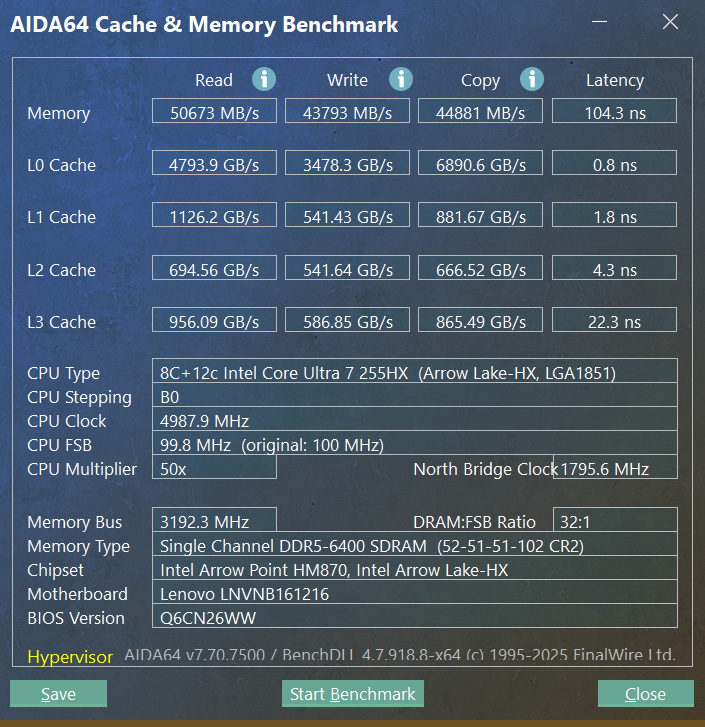 拯救者Y7000P内存为16GB DDR5 6400MHz单通道,读取速度约51000MB/s,写入速度约44000MB/s,对比16GB DDR5 5600MHz单通道内存,提升均达到了10%。
