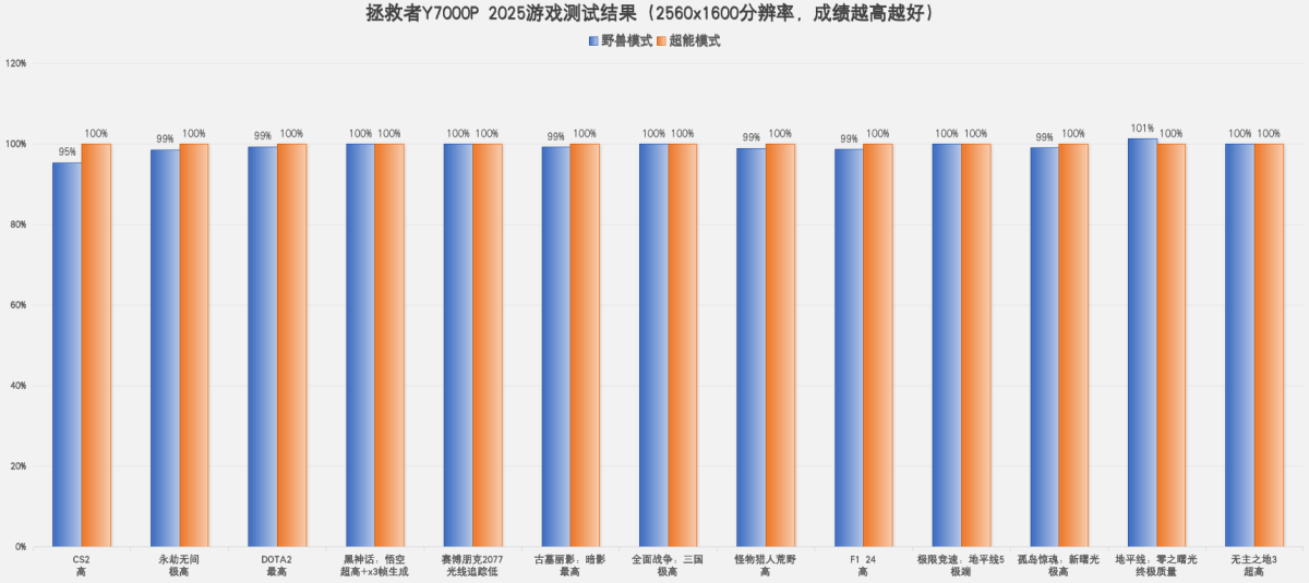 提升至2560x1600分辨率,再次进行测试,结果基本相似,拯救者Y7000P的野兽模式对比超能模式性能下滑,其中幅度最大的是《CS2》,约5%。