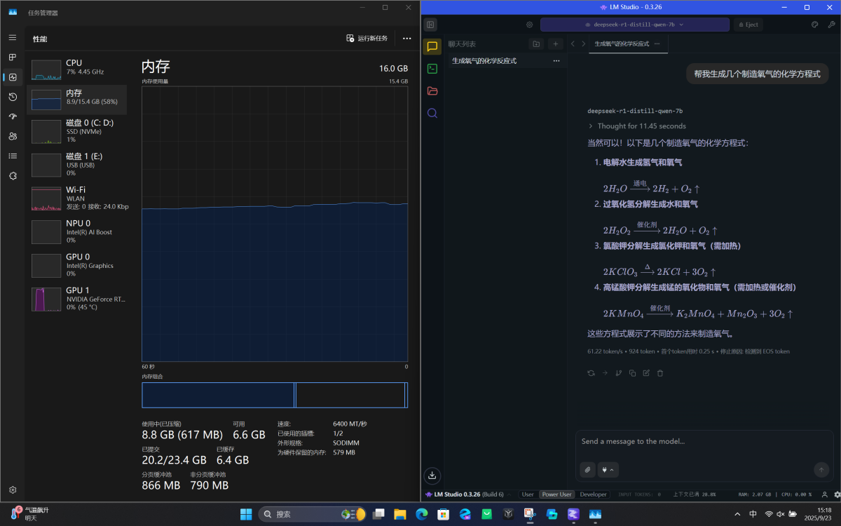 除此之外,搭载酷睿Ultra 7 255HX以及RTX 5060的拯救者Y7000P也具备部署端侧大模型的能力。通过LM Studio部署Qwen-7B模型,在对话中token的生成速度能够达到每秒60个以上,体验可以说是相当流畅了。对于AI初学者、体验者而言,已经足够满足日常应用,不仅速度更快、延时更低,还能更好地保护数据隐私安全。如果想要部署更高参数的模型,建议先将内存扩容至最少32GB。