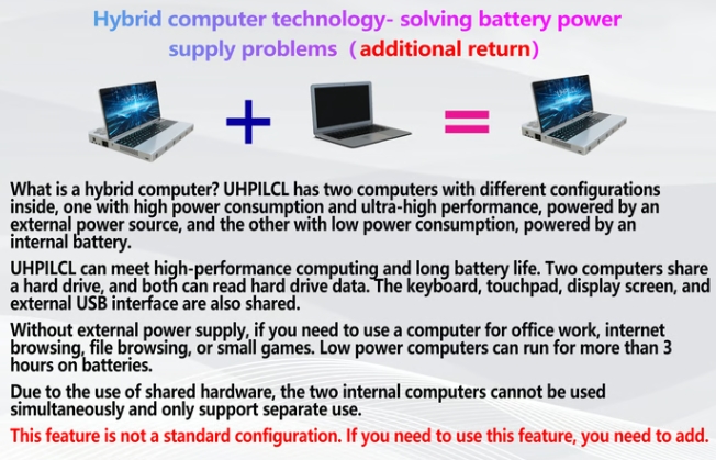 ??更离谱的是,这款产品还提供了一个选配项,它们称之为混合计算机技术,为了解决电池供电问题。简单来说呢,就是它内部会有两台不同的设备,一台通过外部电源供电,功耗高但性能强,一台则有内部电源供电,低功耗续航长,这样它就既可以有高性能,又可以有长续航了。而且它们共享硬盘、键盘、触控板、显示器以及接口等。根据官方的说法,利用内部电源,低功耗的设备运行办公、网页浏览等,能有3小时以上的续航。这个想法倒是挺好的...就是肯定会继续增加产品的重量。