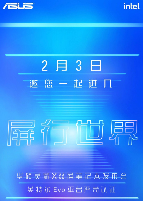 华硕灵耀X双屏笔记本2月3日发布:英特尔Evo平台严苛认证