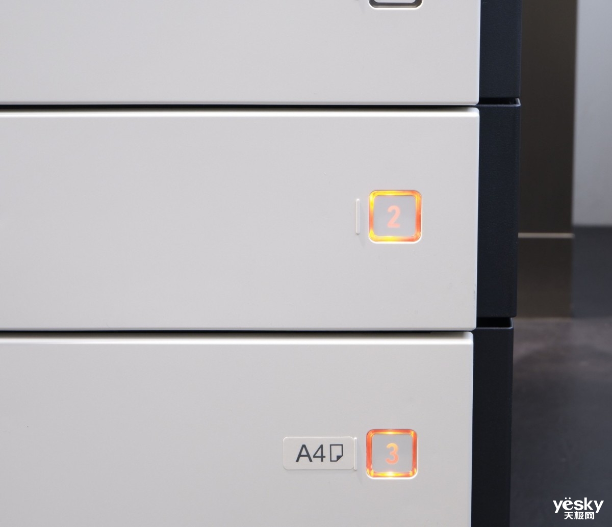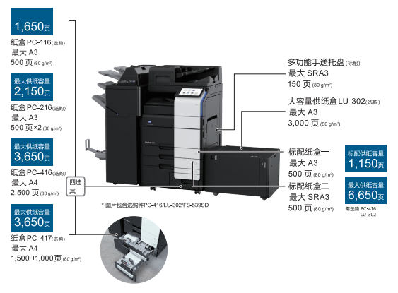 该复合机具备灵活的供纸系统,其配置了两个A3纸盒,纸盒容量为500张,配合侧面手送托盘,标配纸盒容量为1150张。用户根据使用需求选购纸盒后,供纸容量可以达到3,650页。再加上大容量供纸器,设备最大供纸容量为6,650页。其本身也可支持SRA3大幅面、1200mm长纸等打印。