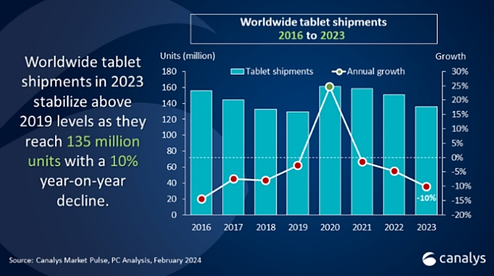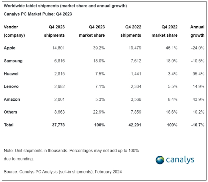2023年平板电脑出货量同比下降10% 苹果依然领跑,华为增长超30%