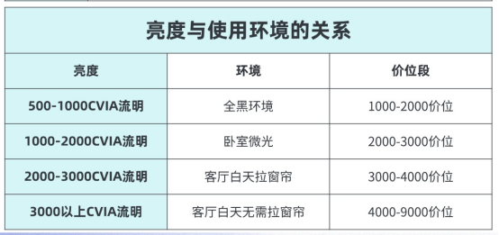 亮度一直是投影画质的关键,亮度不高其他参数再高都是白搭,放在哪里都看不清;不同环境对投影的亮度要求也是不同的,环境光越多的地方亮度需求也就越高,所以一般放客厅的投影建议选择2500CVIA流明以上,放在卧室的投影选择800CVIA流明以上。