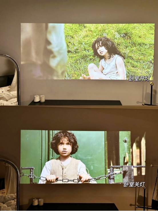 当然了,当贝D6X Pro作为一台卧室投影仪,不仅仅颜值高,画质也相当出色。光源上采用了高端影院同款ALPD激光光源,亮度达到了1200CVIA流明,0.33DMD的显示芯片,支持1080P分辨率,这样的搭配即使在卧室开灯情况下画面效果也非常不错。