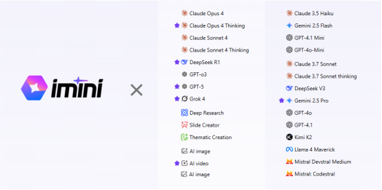 相较于海外备受关注的 Genspark、MiniMax 和 Manus,imini AI 拥有独特的“模型聚合”能力,能把GPT-5、Gemini 2.5 Pro、Grok 4、Claude 4等25款热门AI整合成智能工具箱。其新模型上线极快,GPT - 5、Grok - 4等一推出用户就能即刻体验。而且,它首创“双模型协同回答”机制,运用两个“智能大脑”对回答内容进行交叉验证,能有效避免出现AI幻觉。