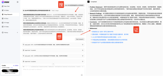 针对学术研究、市场分析等需要多维度数据整合的场景,imini AI的Deep Research Agent可自动完成以下流程:imini AI把“搜、想、证”三步浓缩到短短几分钟:先同时调取网络、学术库和行业报告,把过去几小时的活一次干完;再针对你的研究问题,自动生成“背景 — 方法 — 结果 — 结论”完整框架,每个论点都标好来源;关键数字还会让数值模型和文本模型交叉验证,保证结论靠谱。比如,输入“2024年东南亚新能源车企竞争格局”,原本几个小时的工作量,现在几分钟就能完成。报告内容完整,且章节后还带着模型推理过程,直接就能用。