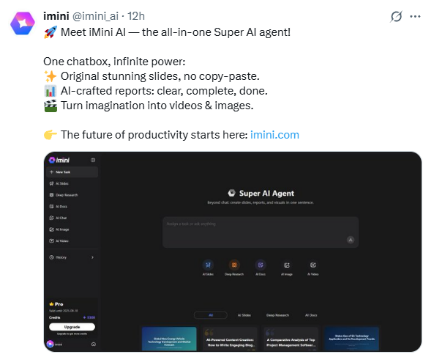 传统工作流程中,完成一份市场分析报告需研究员、设计师、文案多方协作,耗时 2 - 3 个工作日。iMini 的 Super Agent 通过“智能任务拆解 - 跨模态资源调度 - 动态质量校验”三步实现颠覆。系统先将用户指令分解为数据采集、逻辑分析、可视化呈现等子任务,接着自动调用文本生成、图表制作、版式设计等 20 余种专项能力,最后依托行业质检规则库确保输出符合专业标准。
