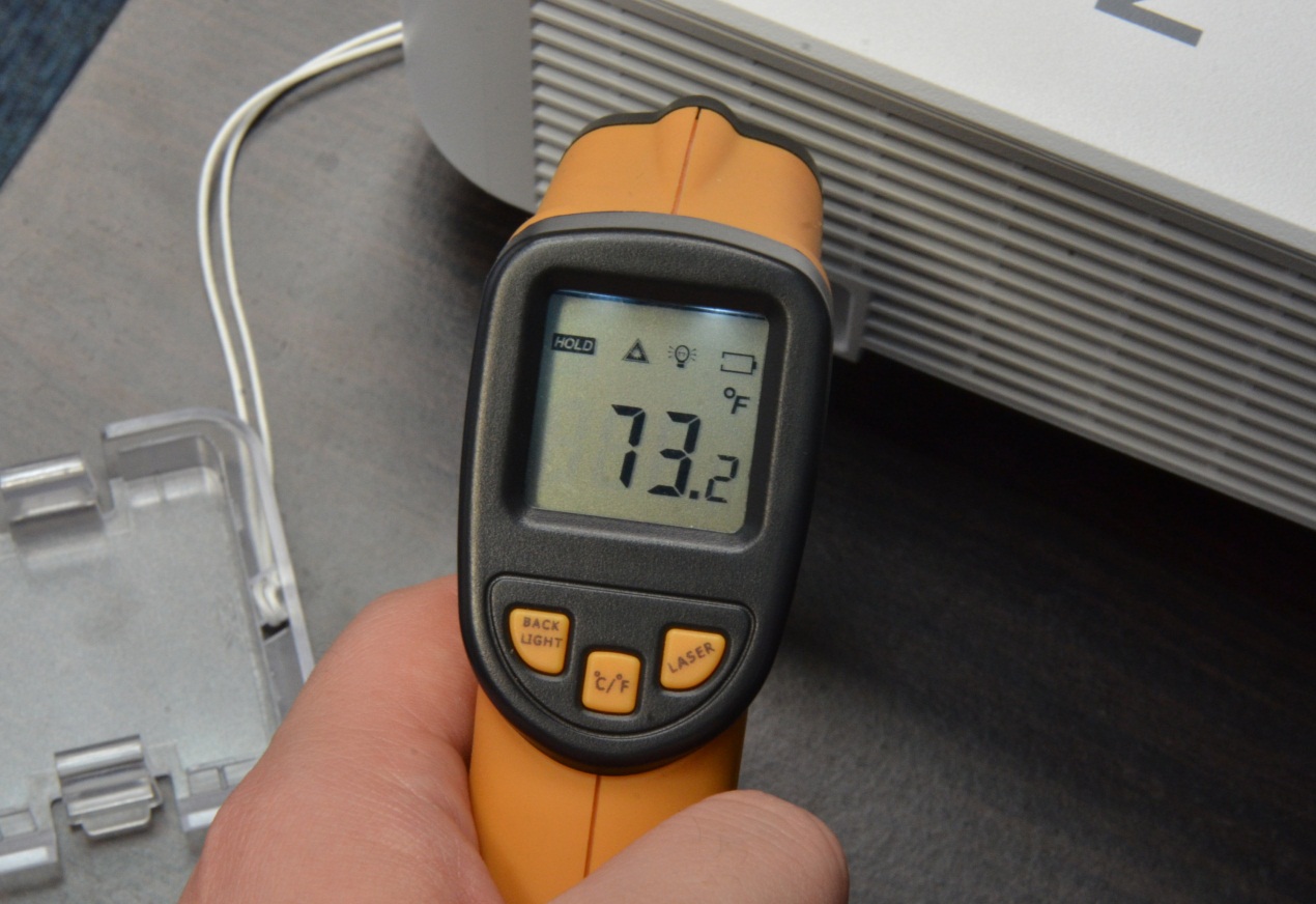 NEC NP-V302WC拥有3000高流明亮度,但散热方面并没受高流明而影响,持续开机1小时候后,只有前置散热口温度达到了73.2°F(73°F=22.78°C)。