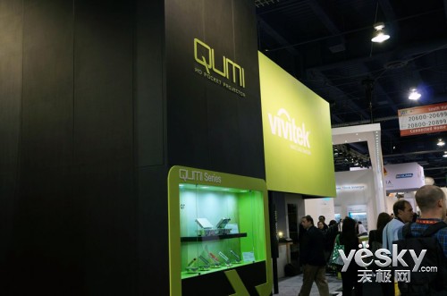 本次Vivitek丽讯展台设计也以微投产品QUMI系列为点睛之笔, 全新亮相的QUMI Q7更成为全场瞩目的焦点。丽讯Qumi Q7较前代产品亮度方面提升到了800流明,具备30000:1的对比度,标准分辨率为宽屏的WXGA(1280×800),可播放720p高清视频。由于采用了德州仪器的DLP Link技术,因而这款微投支持DLP 3D显示功能,并支持2D转3D功能。