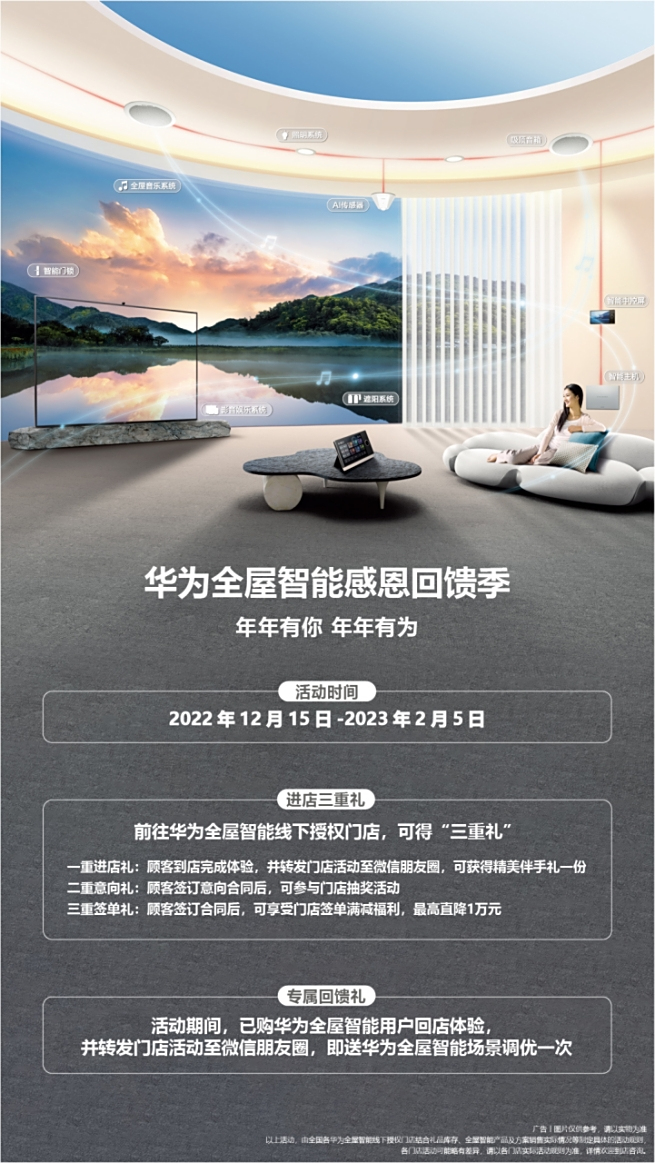 好消息是,为回馈新老用户,2022年12月15日到2023年2月5日,华为全屋智能感恩季倾情回馈,全国80+城市150+门店,均可线上预约到店体验,打卡分享即可获取多重豪礼,有需要的小伙伴一定别错过。