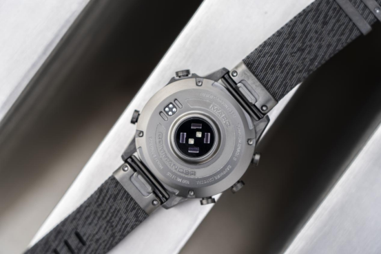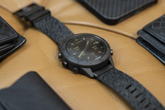 佳明MARQ Commander指挥官碳纤维尊享版高端时尚智能腕表侧边壳体及表圈由130层碳纤维压制而成,并且通过8年的努力,通过混合材料解决了碳纤维材质屏蔽GPS信号的弊端。